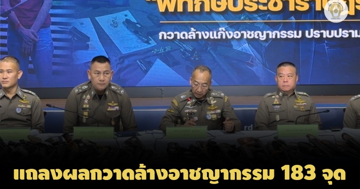 บิ๊กต่อแถลงผลกวาดล้านอาชญากรรม 183 จุด จับผู้ต้องหา 87 ราย ยึดปืนเถื่อน 746 กระบอก เผยคืบหน้าสอบ 32 รายเอี่ยวคดีฮั้วประมูล 9 โครงการ บ.กำนันนก พบ 23 รายให้การปฏิเสธ