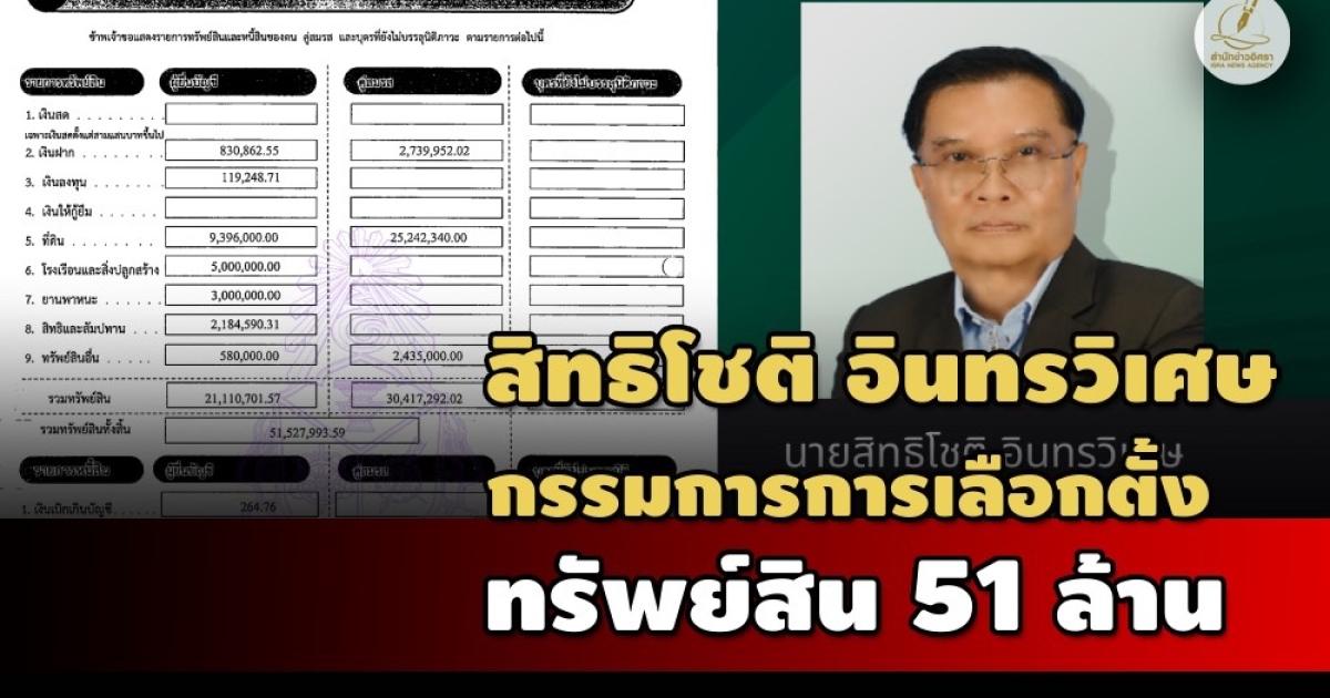 นายสิทธิโชติ และนางพิสมัย อินทรวิเศษ คู่สมรส แจ้งมีทรัพย์สินทั้งสิ้น 51,527,993.59 บาท หนี้สินทั้งสิ้น 3,979,743.65 บาท