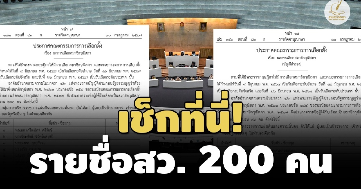ราชกิจจานุเบกษา เผยแพร่ประกาศ กกต. 2 ฉบับรับรองผลการเลือก สว. ทั้ง 200 คน พร้อมบัญชีรายชื่อสำรอง 100 คน