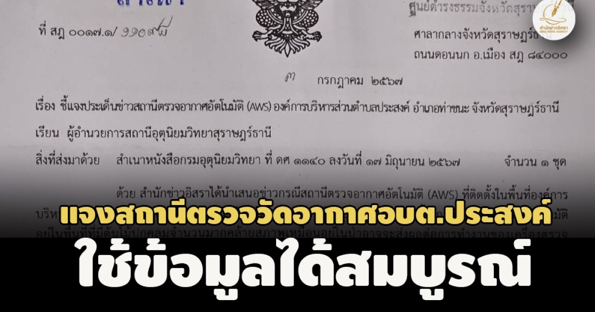 เป็นทางการ! ผอ.กรมอุตุฯ สุราษฎร์ ทำหนังสือแจง 'อิศรา' เป็นทางการ สถานีตรวจวัดอากาศ อ.ท่าชนะ ไม่มีผลกระทบสามารถใช้ข้อมูลได้ครบถ้วนสมบูรณ์ กำชับคู่สัญญาตรวจเช็คบำรุงรักษาปรับภูมิทัศน์โดยรอบตามแผนรับประกัน ระบุการติดตั้งดำเนินการตามกฎหมาย ระเบียบที่เกี่ยวข้องคำนึงถึงประโยชน์ราชการเป็นสำคัญ อบต.ประสงค์ เจ้าของพื้นที่ดูแลรักษาความสะอาดโดยรอบเป็นอย่างดี