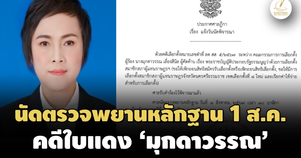 ศาลฎีกาแพร่ประกาศนัด 1 ส.ค. ตรวจพยานหลักฐานคดีกกต.ขอให้เพิกถอนสิทธิสมัครรับเลือกตั้ง ‘มุกดาวรรณ เลื่องสีนิล’ สส.นครศรีธรรมราช พรรคภูมิใจไทย พร้อมเลือกตั้งใหม่ หลังรับคำร้อง สั่งหยุดปฏิบัติหน้าที่ กรณีแจกเงินซื้อเสียง