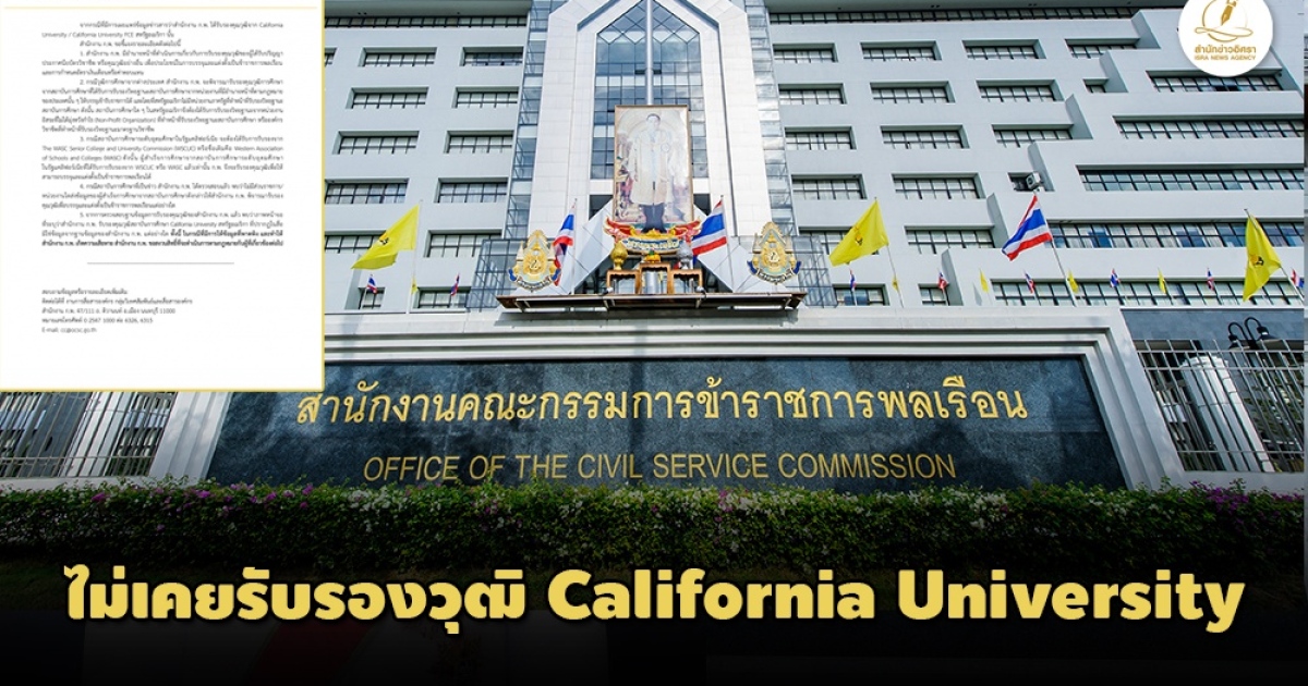 สำนักข่าวอิศรา (www.isranews.org) รายงานว่าเมื่อวันที่ 13 ก.ค. สำนักงานคณะกรรมการข้าราชการพลเรือน(ก.พ.) ออกประกาศชี้แจงกรณีที่มีการเผยแพร่ข้อมูลข่าวสารว่า สำนักงาน ก.พ. ได้รับรองคุณวุฒิจาก California University / California University FCE สหรัฐอเมริกา โดยระบุว่า 1. สำนักงาน ก.พ. มีอำนาจหน้าที่ดำเนินการเกี่ยวกับการรับรองคุณวุฒิของผู้ได้รับปริญญา ประกาศนียบัตรวิชาชีพ หรือคุณวุฒิอย่างอื่น เพื่อประโยชน์ในการบรรจุและแต่งตั้งเป็นข้าราชการพลเรือน และการกำาหนดอัตราเงินเดือนหรือค่าตอบแทน