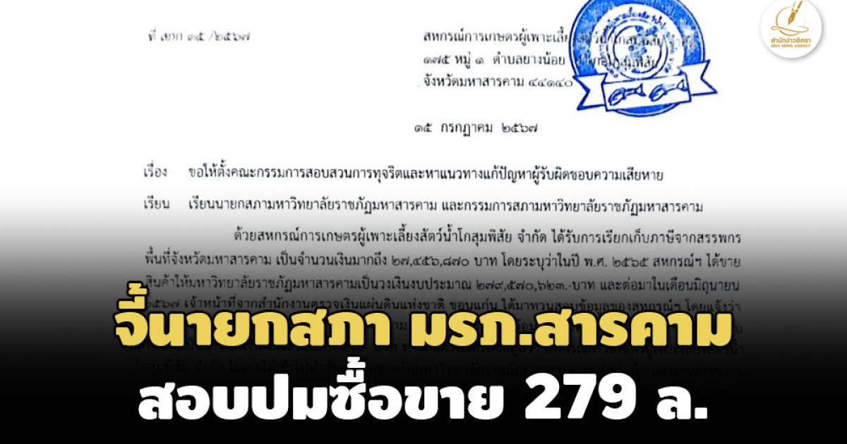 เดินหน้าต่อ! สหกรณ์เลี้ยงสัตว์น้ำ โกสุมพิสัย ยื่นหนังสือร้อง นายก-กรรมการสภาฯ มรภ.สารคาม ตั้ง กก.สอบข้อเท็จจริง กรณี ปธ.ถูกปลอมลายมือร่วมโครงการวิจัยฯ ซื้อขายกว่า 279 ล. ทั้งที่ไม่รู้เรื่อง โดนเรียกเก็บภาษี 27 ล้าน ไม่สามารถดำเนินธุรกิจได้อีก จี้หาตัวผู้รับผิดชอบชดใช้ความเสียหาย