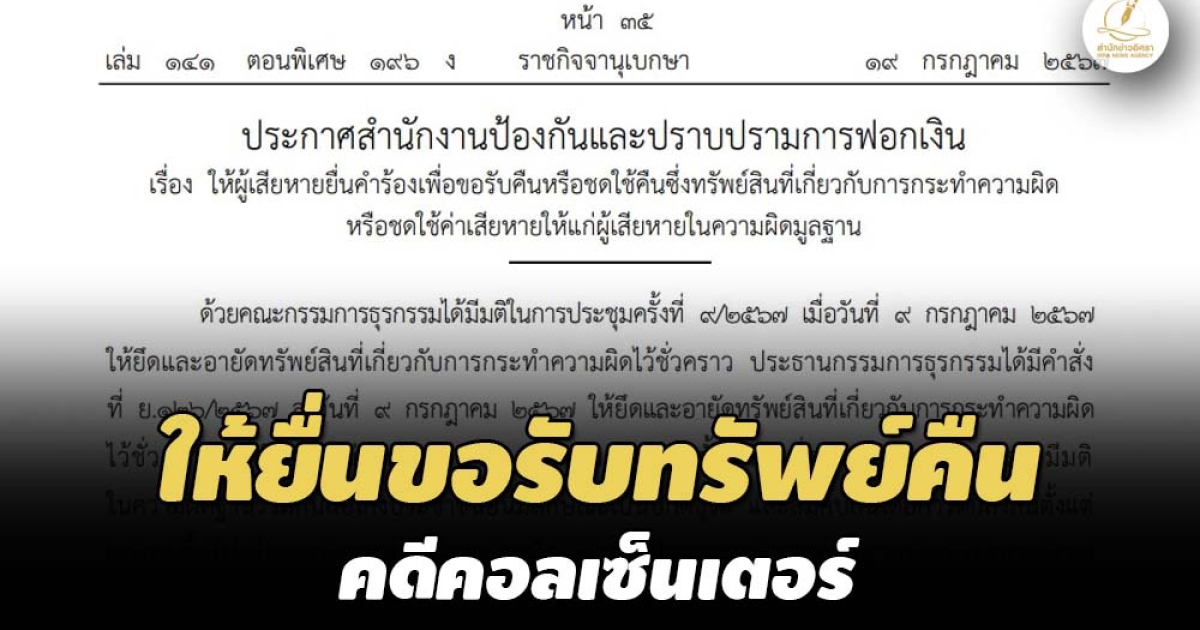 สำนักข่าวอิศรา www.isranews.org รายงานว่า ราชกิจจานุเบกษา วันที่ 19 กรกฎาคม 2567 เผยแพร่ ประกาศสำนักงานป้องกันและปราบปรามการฟอกเงิน เรื่อง ให้ผู้เสียหายยื่นคำร้องเพื่อขอรับคืนหรือชดใช้คืนซึ่งทรัพย์สินที่เกี่ยวกับการกระทำความผิดหรือชดใช้ค่าเสียหายให้แก่ผู้เสียหายในความผิดมูลฐานคดีคอลเซ็นเตอร์ ราย นางสาวพิมานมาศ สุขขาว กับพวก ขอให้บุคคลผู้ได้รับความเสียหายโดยตรงจากการกระทำความผิดมูลฐานในรายคดีดังกล่าวและไม่มีส่วนร่วมในการกระทำความผิด ยื่นคําร้องเพื่อขอรับคืนหรือชดใช้คืนซึ่งทรัพย์สินที่เกี่ยวกับการกระทำความผิดหรือชดใช้ค่าเสียหายให้แก่ผู้เสียหายในความผิดมูลฐานต่อพนักงานเจ้าหน้าที่ ณ สำนักงานป้องกันและปราบปรามการฟอกเงิน ภายใน 90 วัน นับแต่วันประกาศในราชกิจจานุเบกษา