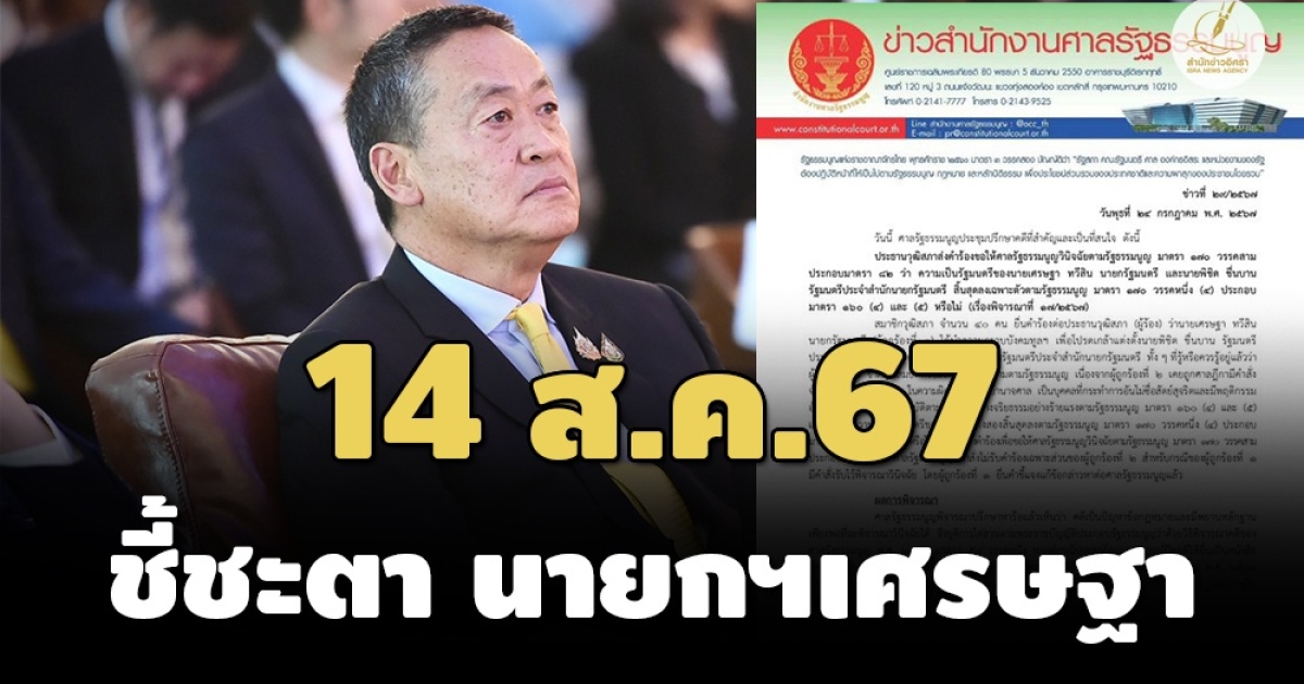 ศาลรัฐธรรมนูญนัด 14 ส.ค.นี้ เวลา 15.00 น. ฟังคำวินิจฉัยกรณี ‘เศรษฐา’ ตั้ง ‘พิชิต ชื่นบาน’ เป็นรัฐมนตรี ส่อทำให้ความเป็นรัฐมนตรีสิ้นสุดลงหรือไม่ พร้อมให้ส่งหนังสือแถลงปิดคดีภายในวันที่ 31 ก.ค.นี้