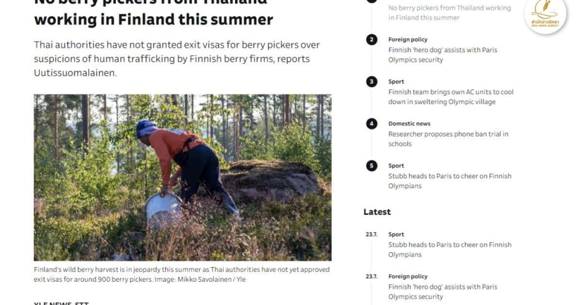 สื่อฟินแลนด์ตีข่าวปีนี้ฟินแลนด์ส่อไร้แรงงานไทยไปเก็บเบอร์รี่ เหตุทางการไทยไม่ยอมอนุมัติใบอนุญาตขาออกให้แรงงาน แม้บริษัทฟินแลนด์จะว่าจ้างแรงงานไทยกว่า 900 คนแล้ว ขณะสมาคมที่ฟินแลนด์ชี้กระทรวงแรงงานไทยไม่ทราบข้อมูลปัญหาด้านการค้ามนุษย์ถูกแก้ไขแล้ว