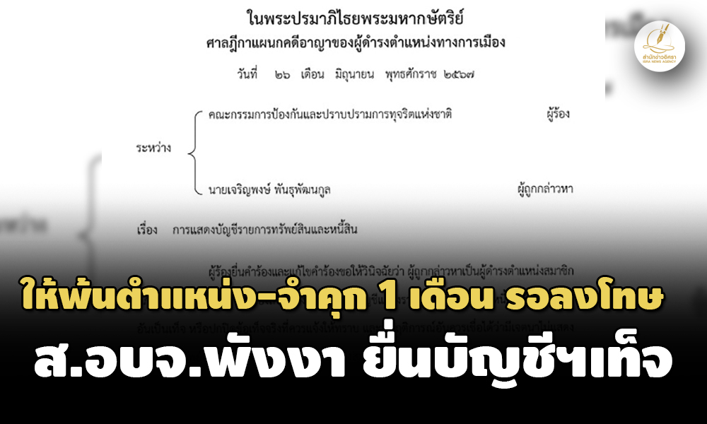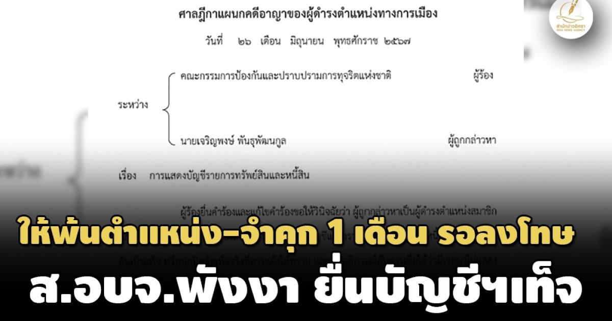 ศาลฎีกาฯพิพากษา‘เจริญพงษ์ พันธุพัฒนกูล’ ส.อบจ.พังงา จงใจยื่นบัญชีทรัพย์สินฯเท็จ ไม่แจ้งเงินฝาก รถยนต์ เงินกู้ ตนเอง เมีย 11 รายการ ให้พ้นตำแหน่งนับแต่ 14 ก.พ. 2567 เพิกถอนสิทธิสมัครรับเลือกตั้งตลอดไป จำคุก 1 เดือน ปรับ 4,000 บาท โทษจำคุก รอการลงโทษ 1 ปี