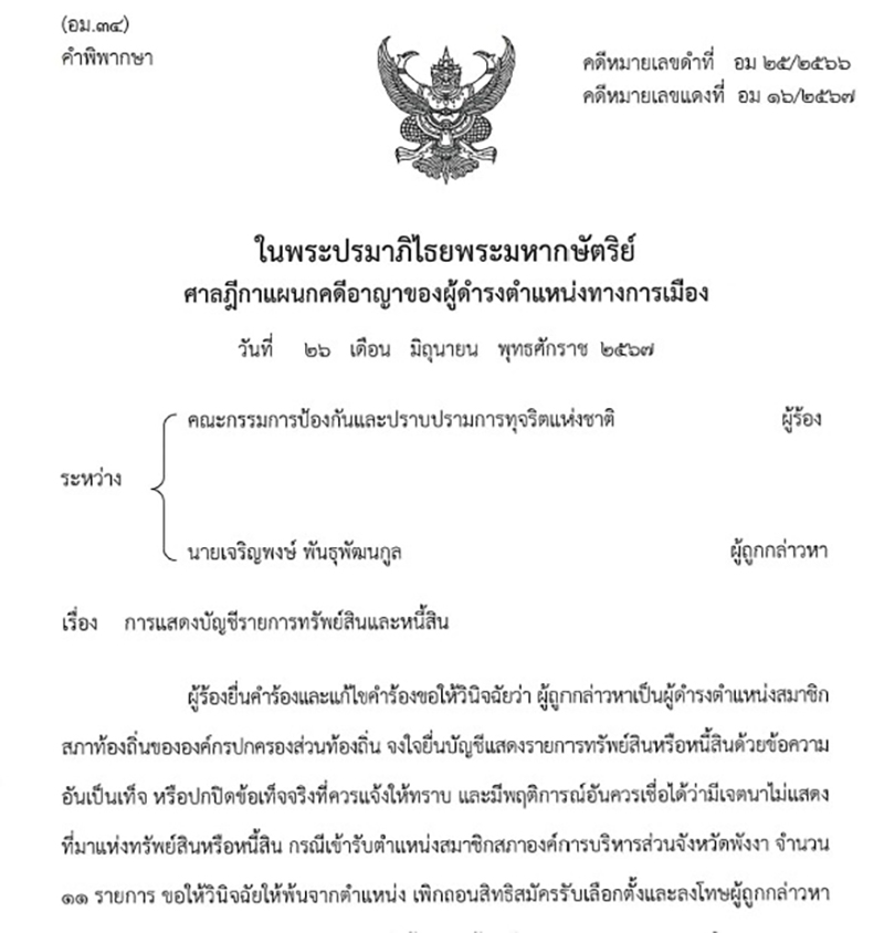 พิพากษาว่า นายเจริญพงษ์ พันธุพัฒนกูล ผู้ถูกกล่าวหา จงใจยื่นบัญชีแสดงรายการทรัพย์สินหรือหนี้สินด้วยข้อความอันเป็นเท็จ หรือปกปิดข้อเท็จจริงที่ควรแจ้งให้ทราบ และมีพฤติการณ์อันควรเชื่อได้ว่ามีเจตนาไม่แสดงที่มาแห่งทรัพย์สินหรือหนี้สิน กรณีเข้ารับตำแหน่งสมาชิกสภาองค์การบริหารส่วนจังหวัดพังงา ตามพระราชบัญญัติประกอบรัฐธรรมนูญว่าด้วยการป้องกันและปราบปรามการทุจริต พ.ศ. 2561 มาตรา 114 วรรคสอง (1) ให้ผู้ถูกกล่าวหาพ้นจากตำแหน่งสมาชิกสภาองค์การบริหารส่วนจังหวัดพังงา นับแต่วันที่ 14 กุมภาพันธ์ 2567 อันเป็นวันที่ศาลฎีกาแผนกคดีอาญาของผู้ดำรงตำแหน่งทางการเมืองมีคำสั่งให้ผู้ถูกกล่าวหาหยุดปฏิบัติหน้าที่ ให้เพิกถอนสิทธิสมัครรับเลือกตั้งของผู้ถูกกล่าวหาตลอดไปตามมาตรา 81 ประกอบมาตรา 114 วรรคสาม กับมีความผิดตามมาตรา 167 ให้จำคุก 2 เดือน และปรับ 8,000 บาท ผู้ถูกกล่าวหาให้การรับสารภาพ เป็นประโยชน์แก่การพิจารณามีเหตุบรรเทาโทษ ลดโทษให้กึ่งหนึ่ง ตามประมวลกฎหมายอาญา มาตรา 78 คงจำคุก 1 เดือน และปรับ 4,000 บาท ไม่ปรากฏว่าผู้ถูกกล่าวหาเคยได้รับโทษจำคุกมาก่อน โทษจำคุกจึงให้รอการลงโทษไว้มีกำหนด 1 ปี ตามประมวลกฎหมายอาญา มาตรา 56 ไม่ชำระค่าปรับให้จัดการตามประมวลกฎหมายอาญา มาตรา 29, 30. (คดีหมายเลขแดงที่ อม 16/2567 วันที่ 26 มิถุนายน 2567)