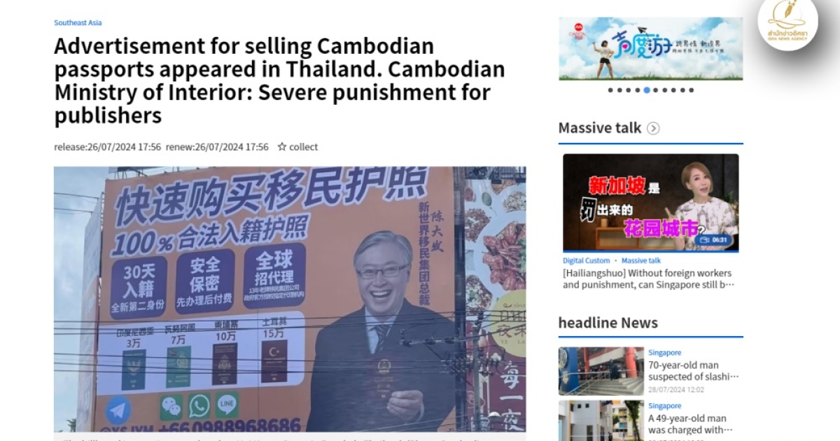 มท.กัมพูชาจี้ทางการไทยลงโทษคนจัดพิมพ์ป้ายโฆษณาขายหนังสือเดินทางกลางย่านห้วยขวาง ด้านโฆษกกระทรวงยืนยันกัมพูชาไม่มีการขายหนังสือเดินทาง ชี้ป้ายโฆษณาทำชื่อเสียง-ภาพลักษณ์เสียหายอย่างรุนแรง