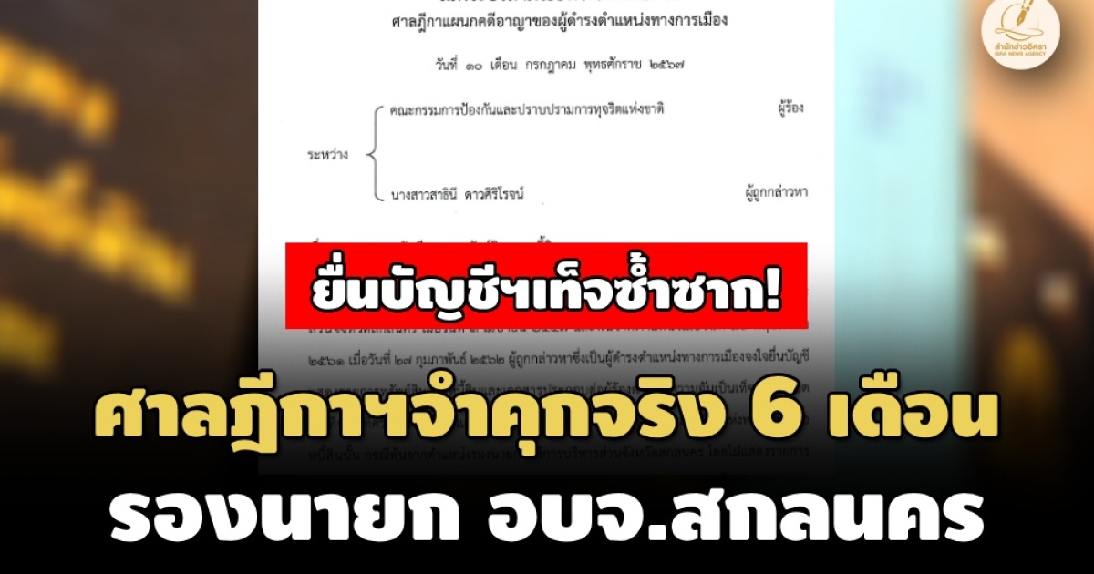 ถอนสิทธิสมัครรับเลือกตั้ง รองนายก อบจ.สกลนคร ไม่ยื่นบัญชีฯ จำคุก1 เดือน-รอลงโทษ