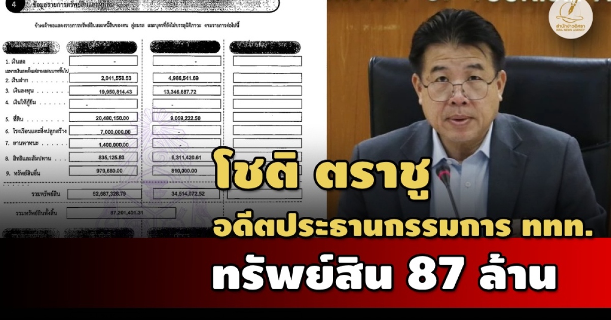 ป.ป.ช.เปิดทรัพย์สินผู้ดำรงตำแหน่งระดับสูง 'โชติ ตราชู' อดีตประธานกรรมการการท่องเที่ยวแห่งประเทศไทย ทรัพย์สิน 87 ล. เงินลงทุน 19 ล. ที่ดิน 8 แปลง 20 ล. รายได้ 1.7 ล./ปี
