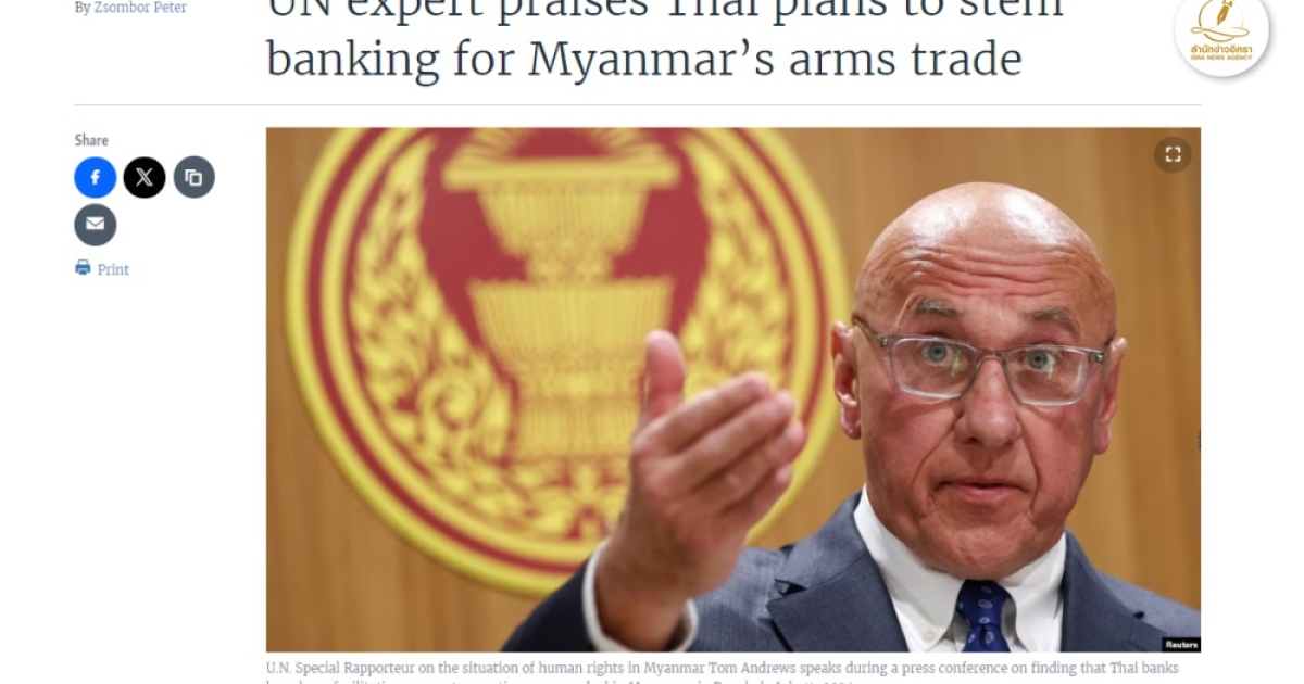 สำนักข่าวอิศรา (www.isranews.org) รายงานสถานการณ์เกี่ยวกับประเทศเมียนมาที่เชื่อมโยงกับประเทศไทยว่าทอม แอนดรูว์ส ผู้รายงานพิเศษด้านสิทธิมนุษยชนของสหประชาชาติในเมียนมาให้สัมภาษณ์กับสำนักข่าววอยซ์ออฟอเมริกาหรือ VOA ว่าเขายินดีที่ประเทศไทยได้มีแผนการจัดตั้งทีมเฉพาะกิจเพื่อช่วยเหลือธนาคารไทยตรวจสอบการทำธุรกิจกับกองทัพเมียนมา เพื่อป้องกันการจัดซื้ออาวุธที่อาจจะเกิดขึ้น