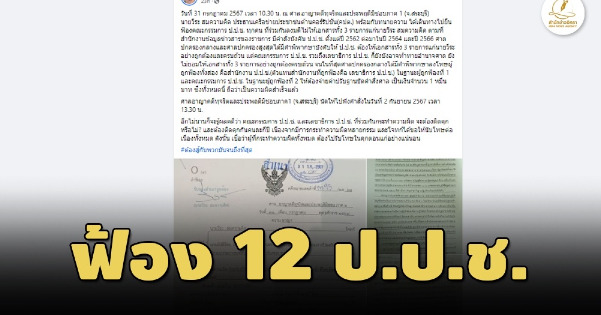 นายวีระยังได้โพสต์เฟซบุ๊กส่วนตัวเพิ่มเติมด้วยโดยระบุว่าศาลอาญาคดีทุจริตและประพฤติมิชอบภาค1 (จ.สระบุรี) ได้นัดให้ไปฟังคำสั่งในวันที่ 2 ก.ย.2567 เวลา 13.30 น.