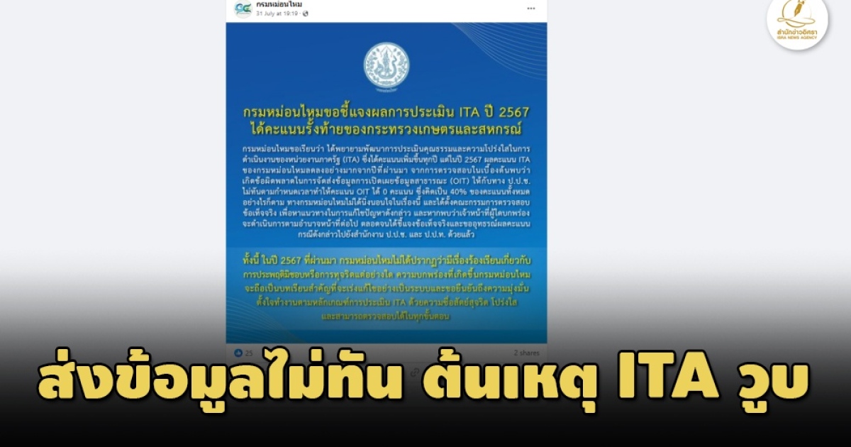 กรมหม่อนไหมขอชี้แจงผลการประเมิน ITA ปี 2567 ได้คะแนนรั้งท้ายของกระทรวงเกษตรและสหกรณ์