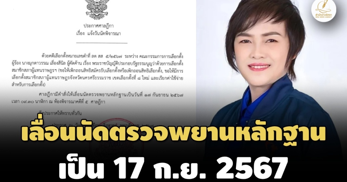 ศาลฎีกาออกประกาศเลื่อนนัดตรวจพยานหลักฐาน คดี กกต.ขอให้เพิกถอนสิทธิสมัครรับเลือกตั้ง ‘มุกดาวรรณ เลื่องสีนิล’ สส.นครศรีธรรมราช พรรคภูมิใจไทย พร้อมให้เลือกตั้งใหม่ กรณีแจกเงินซื้อเสียง จาก 1 ส.ค. เป็น 17 ก.ย. 2567