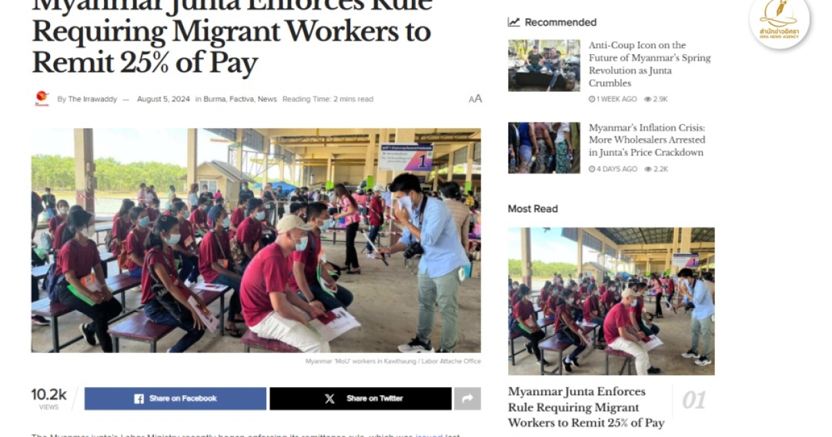 เจ้าหน้าที่ของสหพันธ์หน่วยงานจัดหางานในต่างประเทศเมียนมา (MOEAF) กล่าวว่า “กระทรวงจะไม่ต่ออายุใบอนุญาตทํางานหากพวกเขาไม่สามารถพิสูจน์ได้ว่าพวกเขาได้ส่งเงิน 25 เปอร์เซ็นต์ของรายได้ ในกรณีที่พวกเขาไม่สามารถแสดงหลักฐานได้ แรงงานข้ามชาติจะไม่สามารถทํางานได้อีกสองปี คําสั่งนี้ออกเมื่อวันที่ 30 ก.ค.และมีผลในวันที่ 1 ส.ค.”