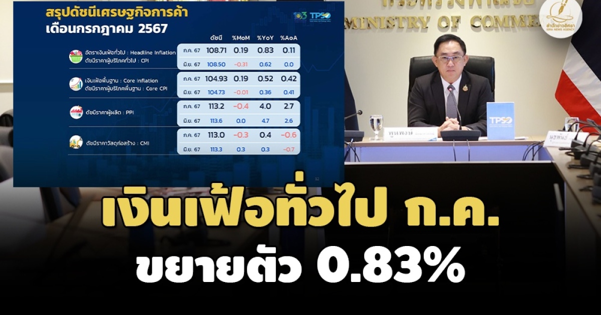 เมื่อวันที่ 7 ส.ค. นายพูนพงษ์ นัยนาภากรณ์ ผู้อำนวยการสำนักงานนโยบายและยุทธศาสตร์การค้า (สนค.) กระทรวงพาณิชย์ แถลงดัชนีเศรษฐกิจการค้า เดือน ก.ค.2567 ว่า ดัชนีราคาผู้บริโภคทั่วไป หรืออัตราเงินเฟ้อทั่วไป (CPI) ในเดือน ก.ค.2567 เท่ากับ 108.71 ขยายตัว 0.83% เมื่อเทียบกับช่วงเดียวกันของปีก่อน โดยอัตราเงินเฟ้อในเดือน ก.ค.2567 ขยายตัวต่อเนื่องเป็นเดือนที่ 4 นับตั้งแต่เดือน เม.ย.2567