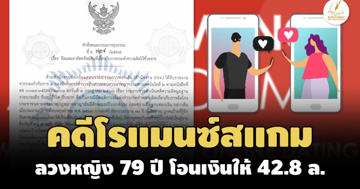 เมื่อประมาณปลายเดือน พ.ค.2566 หญิงอายุ 79 ปี (ผู้เสียหาย) ถูกคนร้ายที่รู้จักกันทางเฟซบุ๊ก และต่อมาได้เป็นเพื่อนกับคนร้ายผ่านแอปพลิเคชันไลน์ มีการพูดคุยกับคนร้ายรูปโปรไฟล์เป็นผู้ชาย ชื่อบัญชีไลน์ dr barls Cakr, Always be Optimistic, U.S Vacation Board was Happiness is my love กลุ่มคนร้ายมีหลายคนและแบ่งหน้าที่กันทำเพื่อหลอกลวงผู้เสียหายโดยการใช้กลอุบายให้ผู้เสียหายหลงรัก (โรแมนซ์สแกม) จนเป็นเหตุให้ผู้เสียหายถูกหลอกลวงให้โอนเงินเข้าไปยังบัญชีเงินฝากธนาคารของกลุ่มคนร้าย รวมเป็นเงินทั้งสิ้น จำนวน 42,876,4550 บาท