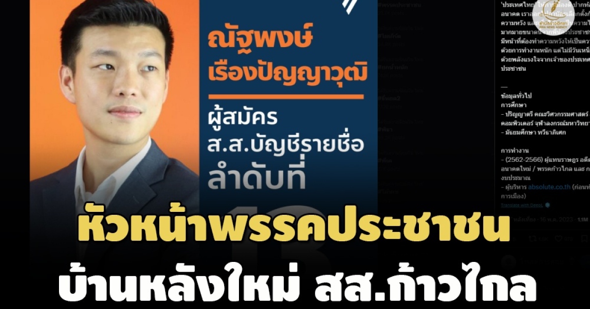 สส.ก้าวไกลเลือก 'ณัฐพงษ์ เรืองปัญญาวุฒิ' เป็นหัวหน้าคนใหม่ ตั้งชื่อใหม่ 'พรรคประชาชน' หลังก้าวไกลถูกศาล รธน.ยุบพรรค ให้ 'ศรายุทธ ใจหลัก' เพื่อนสนิท 'ธนาธร' นั่งเลขาฯพรรค