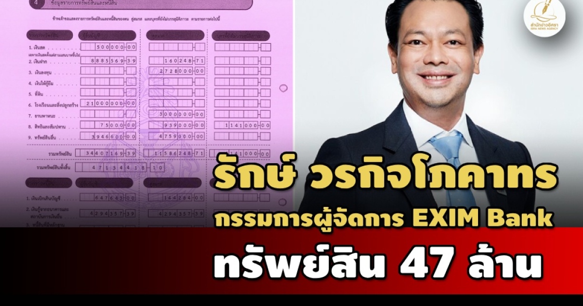 ป.ป.ช.เปิดทรัพย์สินผู้ดำรงตำแหน่งระดับสูง 'รักษ์ วรกิจโภคาทร' กรรมการผู้จัดการ ธนาคารเพื่อการส่งออกและนำเข้าแห่งประเทศไทย ทรัพย์สิน 47 ล. รายได้ 10 ล./ปี