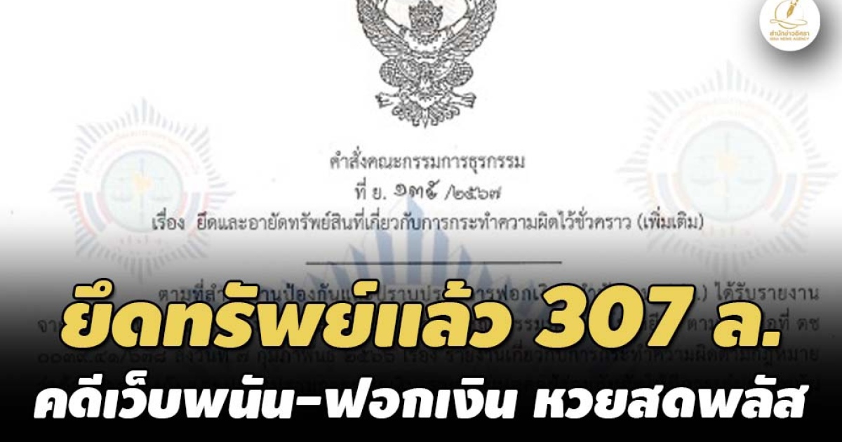 2.คำสั่งคณะกรรมการธุกรรมที่ 117/2567 ลงวันที่ 11 มิ.ย.2567 ยึดทรัพย์สินที่เกี่ยวกับการกระทำความผิดไว้ชั่วคราว (เพิ่มเติม) รายนายอดิศักดิ์ นวลละออง กับพวก ซึ่งเป็นกรณีที่มีพฤติการณ์แห่งการกระทำความผิดเกี่ยวกับการพนันตามกฎหมายว่าด้วยการพนัน โดยเป็นการจัดให้มีการเล่นการพมันทางสื่ออิเล็กทรอนิกส์ผ่านเว็บไซต์ www.huaysodplus.com และความผิดฐานฟอกเงิน รวมทรัพย์สิน 32 รายการ มูลค่า 96,175467.92 บาท ประกอบด้วย ที่ดินพร้อมสิ่งปลูกสร้าง หลักทรัพย์ เงินสด เครื่องประดับ พระเครื่อง เสื้อผ้าและอื่นๆ