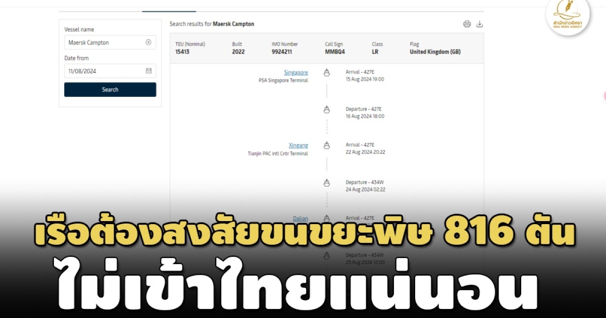 สำนักข่าวอิศรา (www.isranews.org) รายงานข่าวกรณีนี้เพิ่มเติมว่าจากการสำรวจข้อมูลของเว็บไซต์บริษัทสายการเดินเรือเมอร์สก์ (Maersk) ซึ่งเป็นบริษัทเจ้าของเรือบรรทุกสินค้าทั้ง 2 ลำที่ต้องสงสัยว่าจะมีการบรรทุกขยะพิษจำนวน 816 ตันได้แก่เรือเมอร์สก์ แคมป์ตัน (MAERSK CAMPTON) และเรือเมอร์สก์ แคนดอร์ (Maersk Candor) บนเว็บไซต์บริษัทเมอร์สก์แจ้งข้อมูลยืนยันว่าทั้งเรือทั้งสองลำจะไม่เดินทางเข้าประเทศไทยแต่อย่างใด