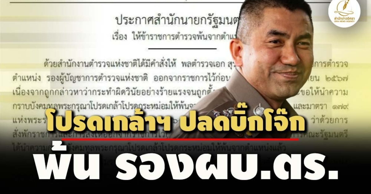 สำนักข่าวอิศรา (www.isranews.org) รายงานว่า เมื่อวันที่ 15 ส.ค.2567 ราชกิจจานุเบกษา เผยแพร่ประกาศสำนักนายกรัฐมนตรีเรื่อง ให้ข้าราชการตำรวจพ้นจากตำแหน่ง ราย พลตำรวจเอก สุรเชชษฐ์ หักพาล พ้นจากตำแหน่งรองผู้บัญชาการตำรวจแห่งชาติ