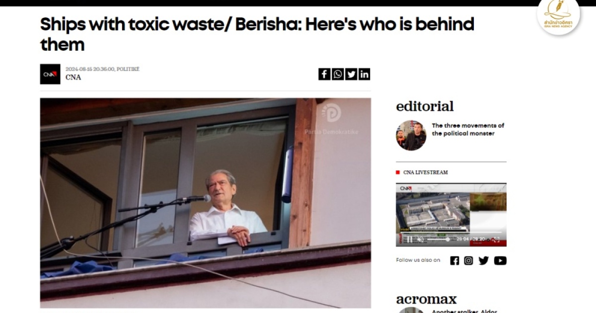 “ถึงมิตรสหาย ทุกวันนี้สื่อทั่วโลกกำลังฮือฮาว่าเรือสองลำของบริษัทขนส่งที่ใหญ่ที่สุดในโลกได้ออกจากดูร์เรสพร้อมกับขยะพิษที่อันตราย ในตู้คอนเทนเนอร์จำนวน 140 ตู้ที่มีการโหลดที่ดูร์เรส” นายเบริชากล่าวและย้ำว่านี่เป็นเรื่องที่คนทั้งโลกเอาไปพูดกัน และเรือที่มุ่งตรงไปยังประเทศไทยถูกทางการไทยบังคับให้หันหลังกลับ นี่เป็นเรื่องที่ยอมรับไม่ได้