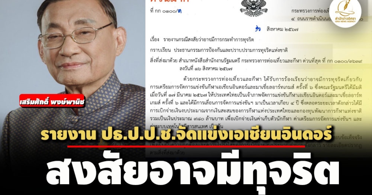 ปมไทยถูกยกเลิกจัดแข่งขันกีฬาเอเชียนอินดอร์-มาร์เชียลอาร์ท! ลามปัญหาทุจริต 'เสริมศักดิ์ พงษ์พานิช' รมว.ท่องเที่ยว-กีฬา ทำหนังสือรายงาน ปธ.ป.ป.ช. เผยสั่งกกท. ตรวจสอบข้อเท็จจริงเบิกจ่ายงบประมาณ 980 ล้านแล้ว หลังมีผู้ร้องเรียนสงสัยอาจมีการกระทำไม่โปร่งใส