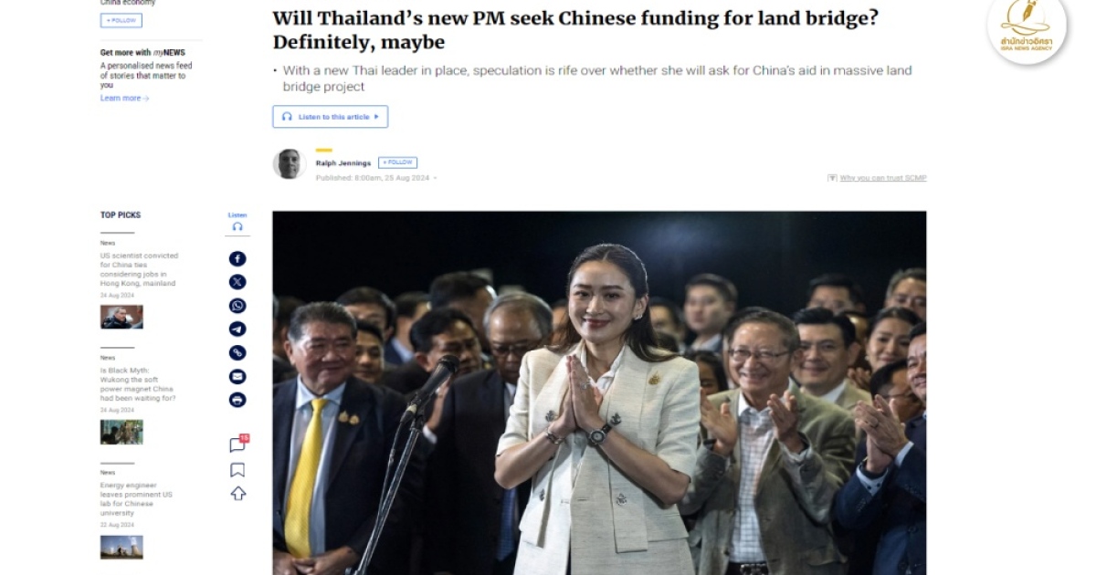 สำนักข่าวอิศรา (www.isranews.org) รายงานข่าวเกี่ยวกับความเห็นโครงการแลนด์บริดจ์จากต่างประเทศ อ้างอิงข่าวจากสำนักข่าวเซาธ์ไชน่ามอร์นิ่งโพสต์ของฮ่องกงระบุตอนหนึ่งเกี่ยวกับบทวิเคราะห์ว่า น.ส.แพทองธาร ชินวัตร นายกรัฐมนตรีไทยคนใหม่จะแสวงหาเงินทุนจากจีนหรือไม่