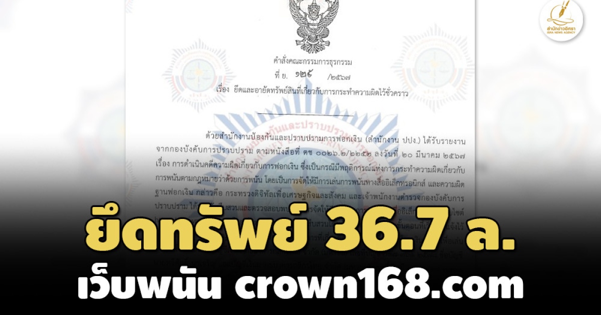 ปปง.สั่งยึดอายัดทรัพย์ 168 รายการ 36.7 ล. ‘ทวีศักดิ์ นาเจริญ’ กับพวกคดีพนันออนไลน์ ฟอกเงิน crown168.com ทั้งทองรูปพรรณ เครื่องประดับ มือถือ พระเครื่อง สินค้าแบรนด์เนม รถยนต์ ที่ดิน สิ่งปลูกสร้าง เงินฝาก กระบือ วัว ด้วย หลังอัยการสั่งฟ้อง 10 ราย