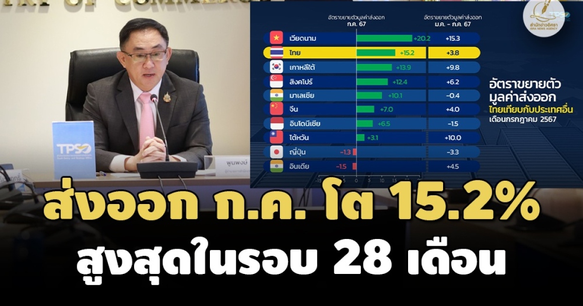 รายงานข่าวจาก สนค. แจ้งว่า การส่งออกเดือน ก.ค.2567 ที่ขยายตัว 15.2% นั้น มีปัจจัยสนับสนุนจากการชะลอตัวของอัตราเงินเฟ้อเฉลี่ยทั่วโลก ซึ่งช่วยเพิ่มอำนาจซื้อให้ผู้บริโภค ในขณะที่การจ้างงานที่เพิ่มขึ้นและการปรับตัวของค่าจ้างในประเทศคู่ค้าสำคัญ โดยเฉพาะในยุโรป ส่งผลให้การบริโภคฟื้นตัว โดยตลาดหลักที่กลับมาฟื้นตัวได้ดี อาทิ สหรัฐ จีน อาเซียน และสหภาพยุโรป สอดคล้องกับการคาดการณ์เศรษฐกิจโลกของ IMF ที่ประเมินว่า เศรษฐกิจโลกจะได้รับปัจจัยบวกจากการฟื้นตัวของเศรษฐกิจจีนจากการส่งออกที่ขยายตัวได้ดี และเศรษฐกิจยุโรปที่ฟื้นตัวจากจุดต่ำสุดแล้ว