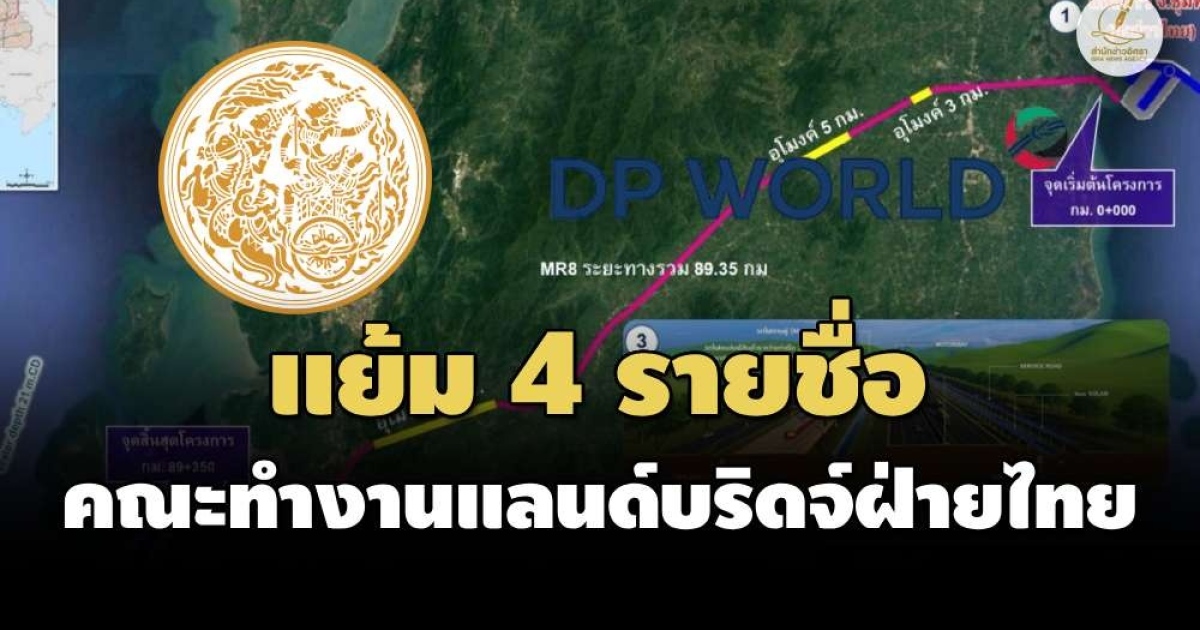 'คมนาคม' เปิด 4 รายชื่อร่วม DP World ศึกษาอภิมหาโปรเจ็กต์ 'แลนด์บริดจ์' ประกอบด้วย 'ปลัดคมนาคม-ผอ.-รองผอ.สนข.-ผอ.กองประเทศ' เล็งเสนอ 'สุริยะ' พิจารณา ก.ย.นี้ ก่อนนัดเปิดหน้าคณะทำงานและนัดหมายประชุมนัดแรกภายในปีนี้ ยืนยันไม่ได้ประเคนโปรเจ็กต์
