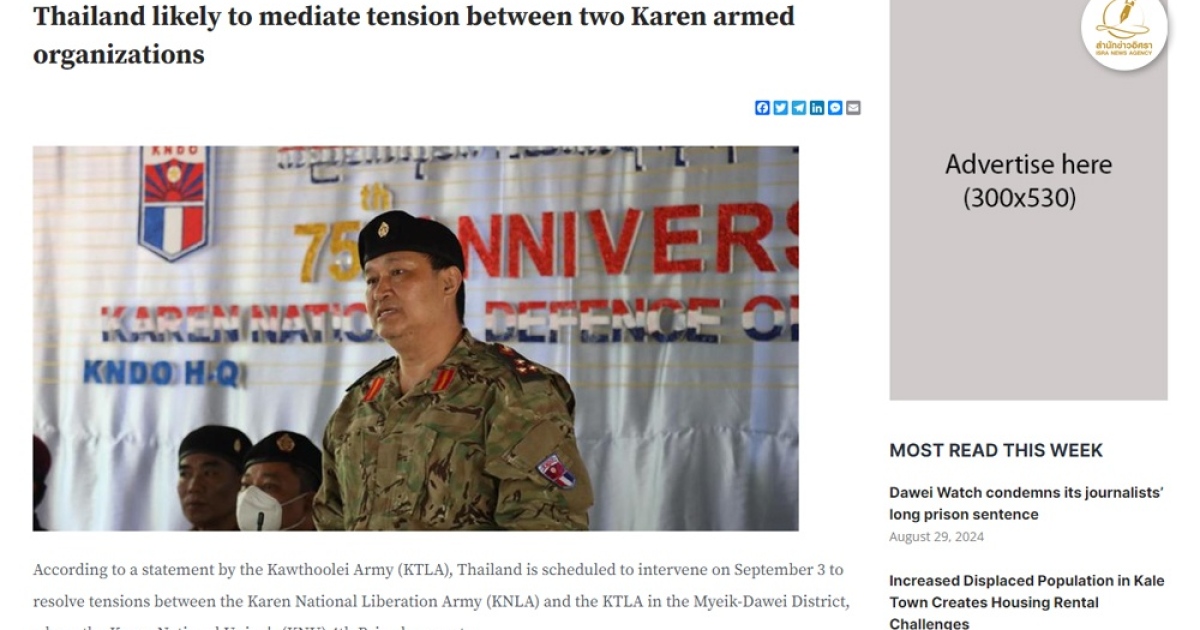 สำนักข่าวอิศรา (www.isranews.org) รายงานข่าวเกี่ยวกับสถานการณ์การสู้รบในเมียนมาที่เชื่อมโยงกับประเทศไทยว่า สำนักข่าวทางการของชาติพันธุ์กะเหรี่ยงหรือ KIC รายงานข่าวกรณีที่ กองทัพกอทูเล Kawthoolei Army (KTLA) ซึ่งเป็นหนึ่งในกองกำลังติดอาวุธของกลุ่มกะเหรี่ยงได้ออกแถลงการณ์เมื่อวันที่ 2 ก.ย.ตอนหนึ่งระบุว่าตัวแทนจากประเทศไทยจะดำเนินการเจรจาในวันที่ 3 ก.ย.ที่ผ่านมา เพื่อแก้ไขความตึงเครียดระหว่างกองทัพปลดปล่อยแห่งชาติกะเหรี่ยง-KNLA และกองทัพ KTLA ในพื้นที่ของกองพลน้อยที่ 4