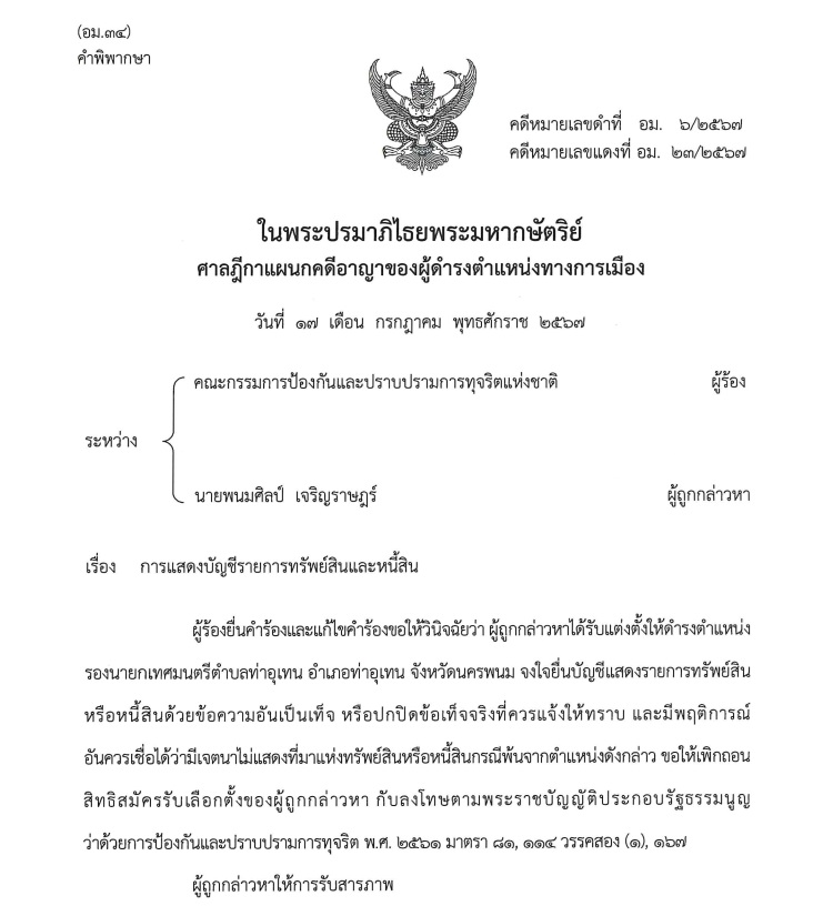 สำนักข่าวอิศรา (www.isranews.org) รายงานว่า ศาลฎีกาแผนกคดีอาญาของผู้ดำรงตำแหน่งทางการเมือง มีคำพิพากษา เมื่อวันที่ 17 กรกฎาคม 2567 ว่า นายพนมศิลป์ เจริญราษฎร์ รองนายกเทศมนตรีตำบลท่าอุเทน อําเภอท่าอุเทน จังหวัดนครพนม ผู้ถูกกล่าวหา จงใจยื่นบัญชีแสดงรายการทรัพย์สินหรือหนี้สินและเอกสารประกอบต่อคณะกรรมการป้องกันและปราบปรามการทุจริตแห่งชาติ (คณะกรรมการ ป.ป.ช.) ผู้ร้องด้วยข้อความอันเป็นเท็จหรือปกปิดข้อเท็จจริงที่ควรแจ้งให้ทราบ และมีพฤติการณ์อันควรเชื่อได้ว่ามีเจตนาไม่แสดงที่มาแห่งทรัพย์สินหรือหนี้สิน กรณีพ้นจากตำแหน่งรองนายกเทศมนตรีตำบลท่าอุเทน ตามพระราชบัญญัติประกอบรัฐธรรมนูญว่าด้วยการป้องกันและปราบปรามการทุจริต พ.ศ. 2561 มาตรา 114 วรรคสอง (1) ให้เพิกถอนสิทธิสมัครรับเลือกตั้งของผู้ถูกกล่าวหาตลอดไป ตามมาตรา 81 วรรคหนึ่งและวรรคสอง ประกอบมาตรา 114 วรรคสาม กับมีความผิดตามมาตรา 167 จำคุก 2 เดือน และปรับ 8,000 บาท ผู้ถูกกล่าวหาให้การรับสารภาพเป็นประโยชน์แก่การพิจารณา มีเหตุบรรเทาโทษ ลดโทษให้กึ่งหนึ่งตามประมวลกฎหมายอาญา มาตรา 78 คงจำคุก 1 เดือน และปรับ 4,000 บาท ไม่ปรากฏว่าผู้ถูกกล่าวหาเคยได้รับโทษจำคุกมาก่อน โทษจำคุกจึงให้รอการลงโทษไว้มีกำหนด 1 ปี
