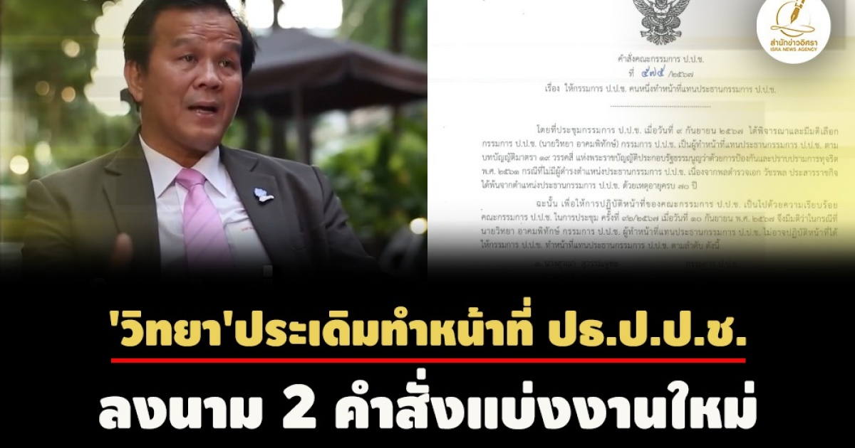 สำนักข่าวอิศรา (www.isranews.org) รายงานว่า เมื่อวันที่ 11 กันยายน 2567 นายวิทยา อาคมพิทักษ์ กรรมการป้องกันและปราบปรามการทุจริตแห่งชาติ (ป.ป.ช.) ทำหน้าที่แทนประธานกรรมการ ป.ป.ช. ได้ลงนามในคำสั่ง 2 ฉบับ คือ 1. เรื่องการให้ กรรมการ ป.ป.ช.ทำหน้าที่แทนประธานกรรมการ ป.ป.ช. ตามลำดับ และ แบ่งงานกำกับดูแลส่วนราชการและงานในด้านการตรวจสอบและไต่ส่วน และการตรวจสอบทรัพย์สินและหนี้สิน