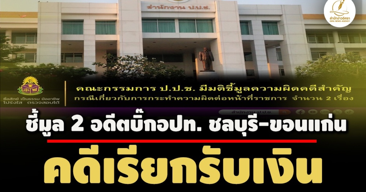 ป.ป.ช.แถลงมติชี้มูล 2 อดีตบิ๊ก อปท. เรียกรับเงิน 'ลิขิต สิริมณีรัตน์' อดีตนายกเทศฯ บางละมุง ชลบุรี โดนกรณีก่อสร้างอาคารศูนย์เด็กเล็ก ให้ผู้รับเหมาจ่าย 109,800 บาท - ร้อยตำรวจตรี เดชา ปะโปตินัง อดีตนายก อบต.เขาสวนกวาง ขอนแก่น ขอ 5, 10 % แลกตอบแทนเงินโบนัส พนง.