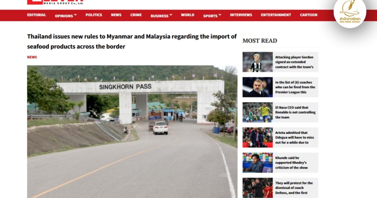 สำนักข่าวอิศรา (www.israenews.org) รายงานสถานการณ์เกี่ยวกับการนำเข้าอาหารทะเลของประเทศไทยจากประเทศเพื่อนบ้านว่ามีรายงานจากสื่อเมียนมาว่าประเทศไทยได้มีการออกระเบียบการใหม่เกี่ยวกับการนำเข้าอาหารทะเลจากเมียนมาและมาเลเซีย