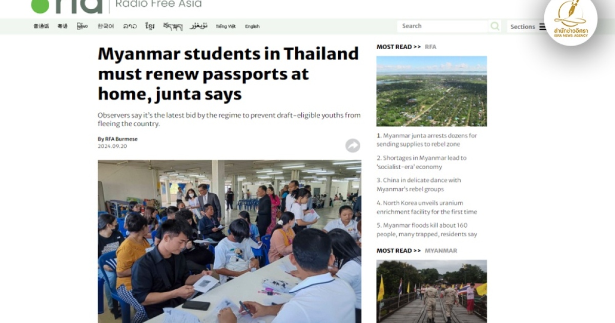 สำนักข่าวอิศรา (www.isranews.org) รายงานข่าวเกี่ยวกับกรณีการต่ออายุหนังสือเดินทางของนักเรียนชาวเมียนมาในประเทศไทยอ้างอิงจากสำนักข่าวเรดิโอฟรีเอเชีย หรือ RFA สหรัฐอเมริกาว่า เมื่อวันที่ 20 ก.ย.ที่ผ่านมา เผด็จการทหารเมียนมาได้ออกประกาศว่าชาวเมียนมาที่กำลังศึกษาระยะสั้นในประเทศไทยด้วยวีซ่าสำหรับการศึกษาระยะสั้นจะไม่สามารถต่ออายุหนังสือเดินทางได้ที่สถานทูตในกรุงเทพและเชียงใหม่ และจะต้องกลับไปที่ประเทศเมียนมาเพื่อดำเนินการต่ออายุหนังสือเดินทาง