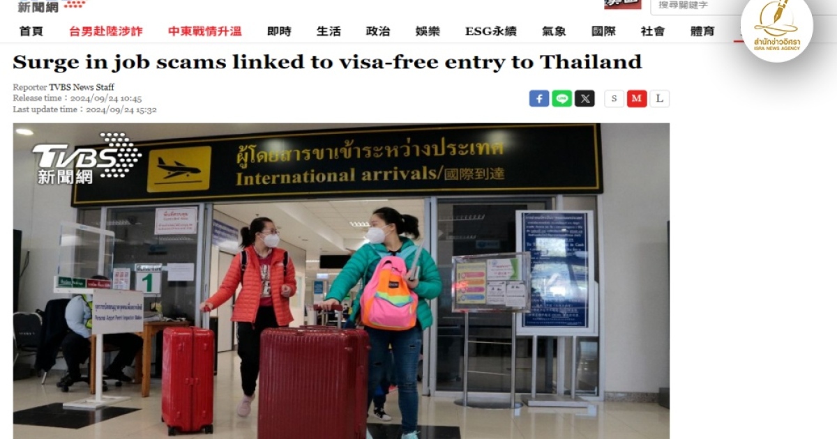 สำนักข่าวอิศรา (www.isranews.org) รายงานข่าวเกี่ยวกับกรณีปัญหาการเปิดฟรีวีซ่าของประเทศไทยว่าเมื่อวันที่ 23 ก.ย.ที่ผ่านมา กระทรวงต่างประเทศไต้หวันได้รายงานถึงกรณีการพุ่งขึ้นของคดีฉ้อโกงการจัดหางานที่เกี่ยวข้องกับการเปิดฟรีวีซ่าของประเทศไทย และเตือนให้สาธารณชนคอยระแวดระวังในเรื่องเหล่านี้