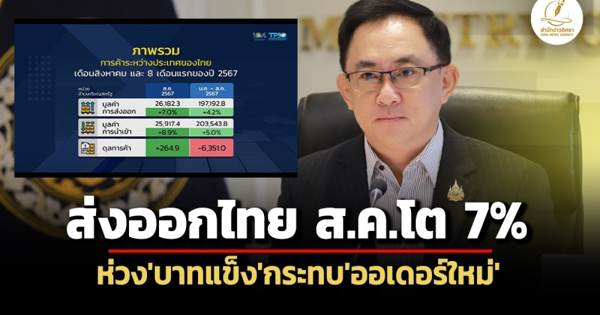 ‘พาณิชย์’ เผยส่งออกไทย ส.ค.67 ขยายตัว 7% ส่งผลให้ 8 เดือนแรกโต 4.2% คงเป้าส่งออกทั้งปี 67 ที่ 1-2% แม้เงินบาทแข็งค่า ด้าน ‘สรท.’ คาดบาทแข็งกระทบ ‘ยอดคำสั่งซื้อใหม่’ ในช่วงเดือน พ.ย. ยาวไปจนถึงไตรมาส 1 ปีหน้า ห่วง ‘รายเล็ก’ ขาดสภาพคล่อง-อาจขาดทุนจากอัตราแลกเปลี่ยน