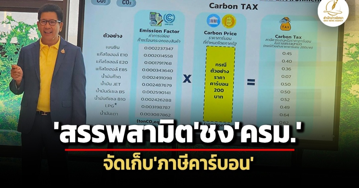 เมื่อวันที่ 30 ก.ย. นายเอกนิติ นิติทัณฑ์ประภาศ อธิบดีกรมสรรพสามิต เปิดเผยว่า ขณะนี้กรมฯได้เสนอแนวทางการจัดเก็บภาษีคาร์บอน (Carbon Tax) ให้ รมว.คลัง พิจารณาแล้ว โดยล่าสุดได้รับทราบว่า รมว.คลัง ได้ลงนามเพื่อเสนอเรื่องเข้าสู่การพิจารณาของคณะรัฐมนตรี (ครม.) แล้ว ซึ่งก็ต้องรอว่าจะมีการบรรจุเรื่องนี้เข้าวาระการประชุมของ ครม. เมื่อใด อย่างไรก็ดี การจัดเก็บภาษีคาร์บอนดังกล่าวจะไม่กระทบต่อราคาขายปลีกน้ำมัน