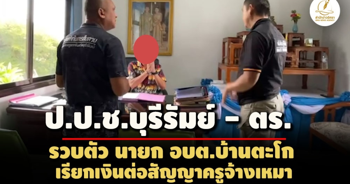 ป.ป.ช.บุรีรัมย์ สนธิกำลัง ตร. เข้าจับกุม นายก อบต.บ้านตะโก อ.ห้วยราช มีพฤติการณ์เรียกรับเงินต่อสัญญาครูจ้างเหมาบริการ วางแผนจ่ายเงินสด 1 พัน ที่ห้องทำงาน เจ้าตัวปฏิเสธอ้างถูกจัดฉาก นำตัวสอบปากคำลงบันทึกประจำวัน ดำเนินคดีตามขั้นตอนกม.แล้ว