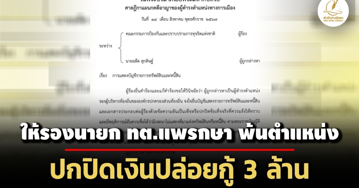ศาลฎีกาฯพิพากษา ‘อดีต สุกดิษฐ์’ รองนายกเทศฯต.แพรกษา สมุทรปราการ จงใจยื่นบัญชีทรัพย์สินเท็จป.ป.ช. ไม่แสดงเงินให้กู้ยืม 2 รายการ 3 ล้าน 2 ครั้ง ทั้งรับดอกเบี้ยทุกเดือน ให้พ้นตำแหน่ง เพิกถอนสิทธิสมัครรับเลือกตั้งตลอดชีพ จำคุก 2 เดือน ปรับ 8,000 บาท รอลงโทษ 1 ปี