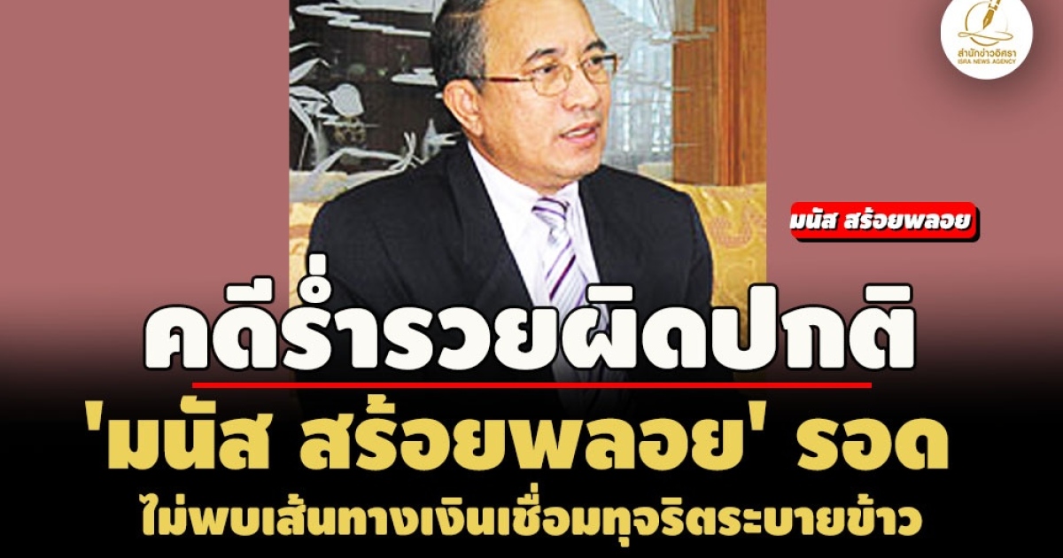 ป.ป.ช.ตีตกคดี 'มนัส สร้อยพลอย' ร่ำรวยผิดปกติ หลังสอบทรัพย์สิน เงินฝาก ซื้อรถยนต์ พบเจ้าตัว-ภรรยา มีฐานะรายได้เพียงพอ แถมไม่พบเส้นทางเงินเชื่อมคดีทุจริตระบายข้าว ไร้ธุรกรรมรับโอนเงินจากต่างประเทศ-ซื้อขายทองคำ