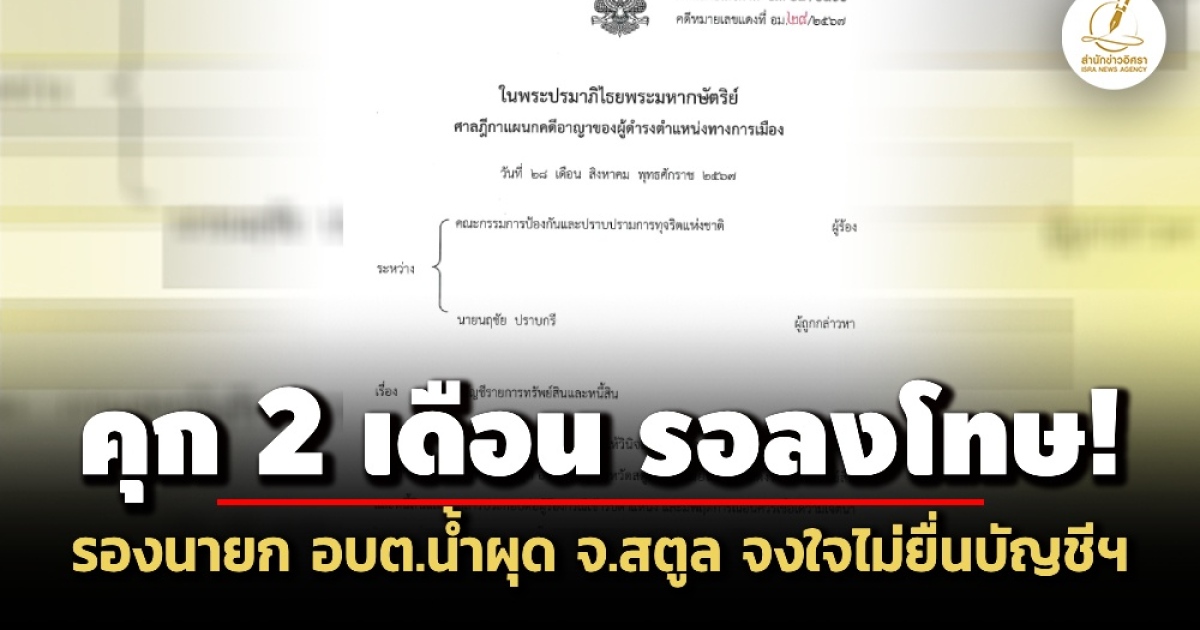 รองนายก อบต.หนองบัวใต้ หนองบัวลำภู ไม่ยื่นบัญชีฯ 2 ครั้ง จําคุก 2 เดือน ให้รอลงโทษ