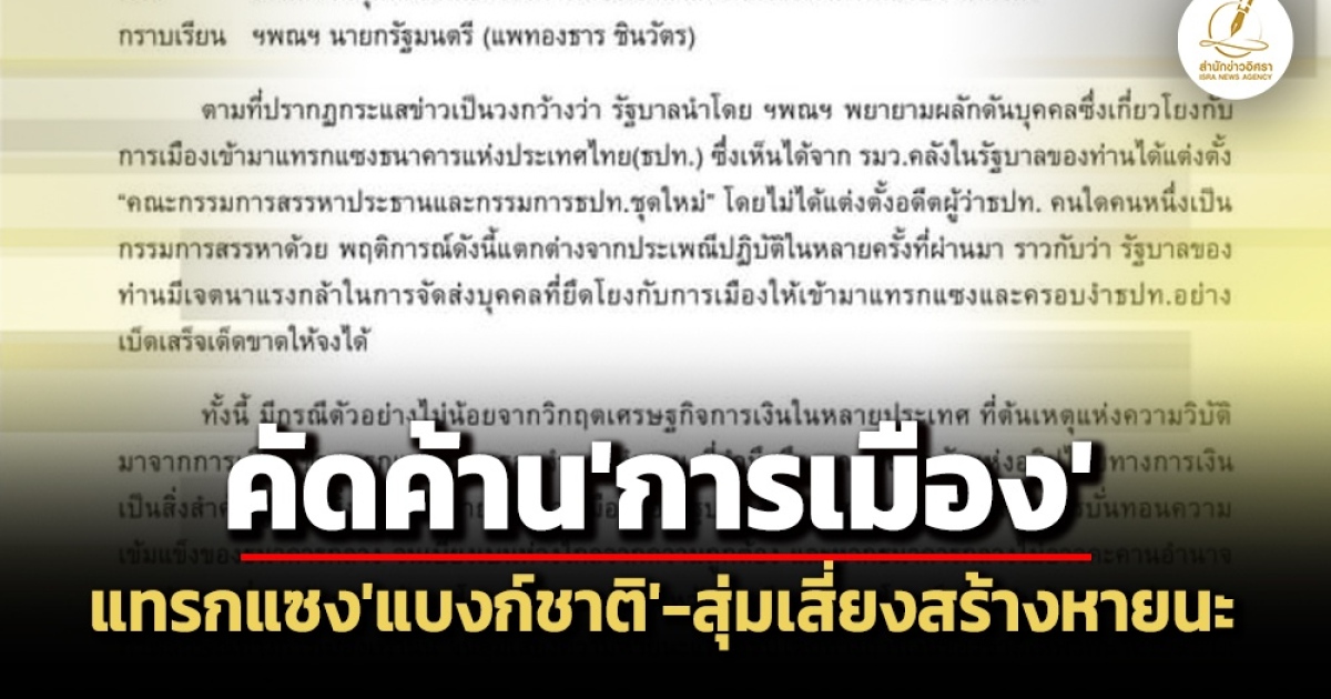 ตามที่ปรากฏกระแสข่าวเป็นวงกว้างว่า รัฐบาลนำโดย ฯพณฯ พยายามผลักดันบุคคลซึ่งเกี่ยวโยงกับการเมืองเข้ามาแทรกแซงธนาคารแห่งประเทศไทย(ธปท.) ซึ่งเห็นได้จาก รมว.คลังในรัฐบาลของท่านได้แต่งตั้ง “คณะกรรมการสรรหาประธานและกรรมการธปท.ชุดใหม่” โดยไม่ได้แต่งตั้งอดีตผู้ว่าธปท. คนใดคนหนึ่งเป็นกรรมการสรรหาด้วย พฤติการณ์ดังนี้แตกต่างจากประเพณีปฏิบัติในหลายครั้งที่ผ่านมา ราวกับว่า รัฐบาลของท่านมีเจตนาแรงกล้าในการจัดส่งบุคคลที่ยึดโยงกับการเมืองให้เข้ามาแทรกแซงและครอบงำ ธปท.อย่างเบ็ดเสร็จเด็ดขาดให้จงได้