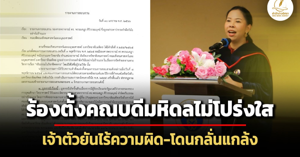 ร้องเรียน 'อิศรา' อ้างตั้ง คณบดีคณะสังคมศาสตร์ฯม.มหิดล ไม่โปร่งใส่ เคยถูกสอบปัญหาคัดลออกผลงานวิจัย ด้านเจ้าตัวแจงเข้ากระบวนการสอบสวนแล้ว ไร้ความผิด เป็นผู้บริสุทธิ์ อธิการบดีเซ็นยุติเรื่องเอง