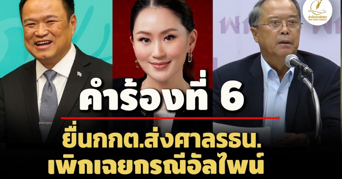คำร้องที่ 6 มาแล้ว! คณะนิติชน-เชิดชูธรรม ยื่น กกต. ส่งเรื่องศาลรัฐธรรมนูญ วินิจฉัยความเป็นรัฐมนตรี 'แพทองธาร ชินวัตร-อนุทิน ชาญวีรกุล รมว.มหาดไทย-ชูศักดิ์ ศิรินิล รมต.ประจำสำนักนายกฯ' สิ้นสุดลงหรือไม่ กรณีเพิกเฉยไม่ดำเนินการเพื่อให้มีการคืนที่ธรณีสงฆ์ให้กับวัดธรรมิการามวรวิหาร ชี้ปัจจุบันครอบครัวนายกฯ ยังคงเป็นผู้ถือหุ้น บ.อัลไพน์ฯ เจ้าตัวต้องสั่งการด้วยตนเองให้ชัดเจน ไม่ให้หน่วยงานรัฐเกรงใจ