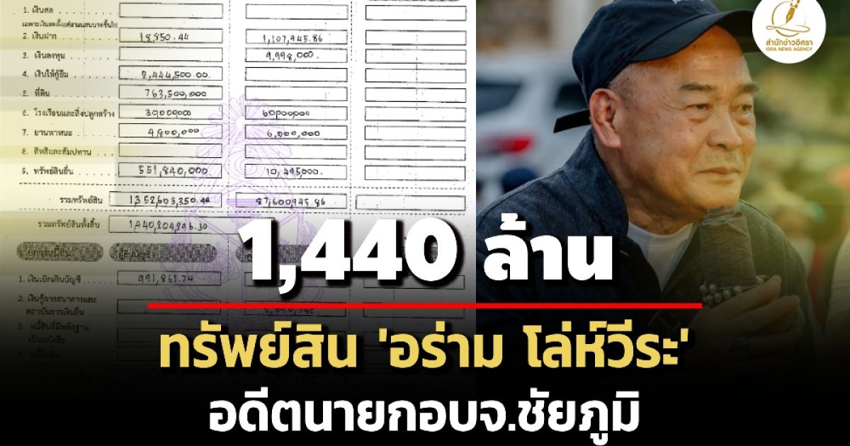 ป.ป.ช.เปิดทรัพย์สินผู้บริหารท้องถิ่น 'อร่าม โล่ห์วีระ' อดีตนายกองค์การบริหารส่วนจังหวัดชัยภูมิ ทรัพย์สิน 1.4 พันล้าน รายได้ 2 แสน/ปี ลดลงจากกรณีเข้ารับตำแหน่งปี 64 245 ล.